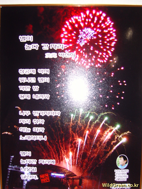 별이 놀다간 자리 어둠에 박혀 빛나던 별이 까만 밤 땅에 내려와 나무 빈 가지마다 자리 찾아 하늘 따라 노래하더니 별이 놀다간 자리에 나뭇잎 달린다. 제54차 한국아동문학 여름쎄미나가 군산 리버힐호텔에서 1박2일간 있었습니다. 작품은 로비에 전시 되었던 것임.
