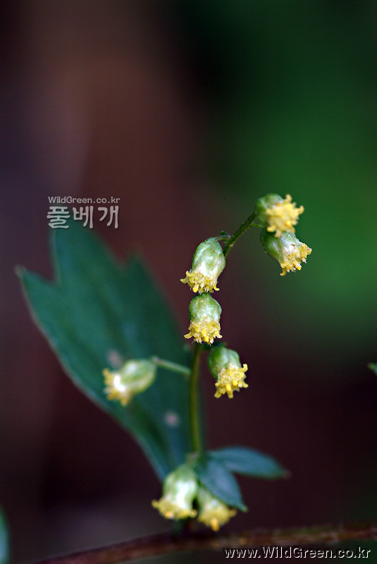 형태=잎은 호생하며 넓은 주걱형이고 길이 3-10cm, 나비 1.5-4.5cm로서 밑부분이 좁아져서 엽병으로 되며 끝에 원두 또는 결각상의 톱니가 있고 표면에 잔털이 있으며 뒷면에 선점과 더불어 견모가 있다. 중앙부의 잎은 도란형 또는 주걱형이고 둔두이며 길이 4.5-8.5cm, 나비 17-40mm로서 표면에 잔털이 있고 뒷면에 견모가 밀생하며 상반부에 결각상의 톱니가 있고 밑으로 갈수록 좁아지지만 가탁엽(假托葉)으로 되지 않으며 위로 올라갈수록 작아진다. 꼭대기 잎은 피침형으로 밑이 쐐기모양이고 위쪽이 여러 갈래로 얕게 갈라지며, 톱니모양의 치아연이 있으며 후질(厚質)이다.