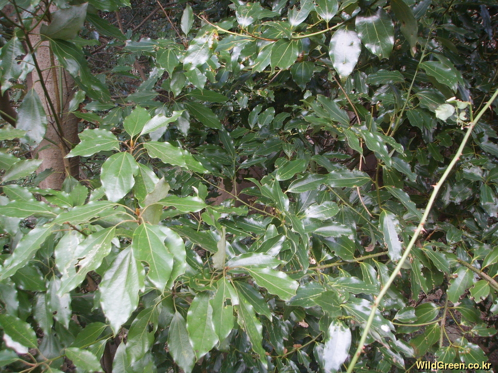 왼편의 잎이 좀 더 큰 식물이 참식나무이고 오른편의 잎이 더 가는 식물이 생달나무 이다.
