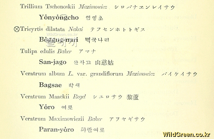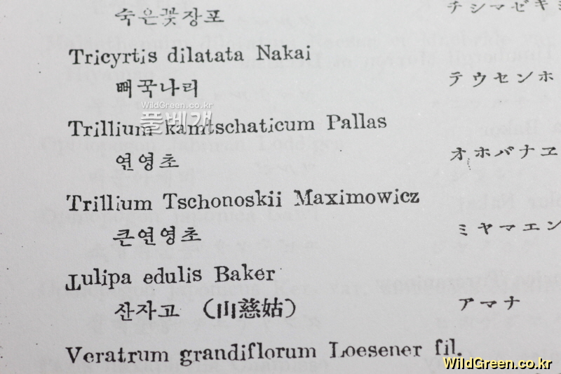 朝鮮植物鄕名集에는 연영초(Trillium tschonoskii)만 기록되어있을뿐 큰연영초는 목록에 아예 빠져있습니다.