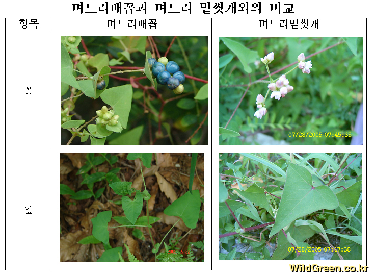 잎 | 잎은 호생하고 긴 엽병이 잎 밑에서 약간 올라붙어 있어 배꼽이라는 이름이 생겼으며 삼각형이고 끝이 뾰족하며 밑부분이 절저 또는 얕은 심장저이고 길이 3-6cm, 폭 3-8cm로서 가장자리가 파상이며 표면은 녹색이고 뒷면은 흰빛이 돌며 엽맥 위에 거슬러 난 잔 가시가 있다. | 잎은 호생하고 긴 엽병이 있으며 삼각형이고 길이와 폭이 각각 4-8cm로서 예두이며 심장저이고 양면에 털이 있으며 탁엽은 잎같지만 작고 녹색이다. 엽병과 엽맥에 거슬러난 갈고리가시가 성글게 있다. |