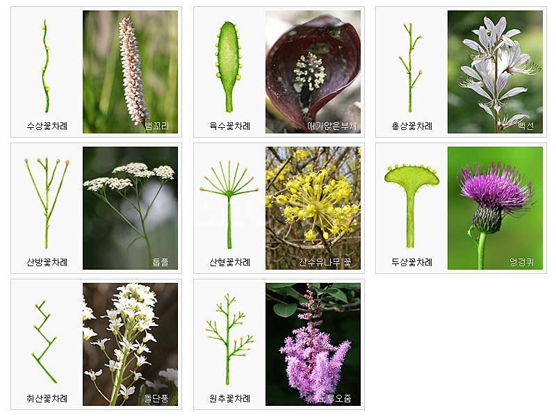 ⑴ 총수꽃차례:꽃대 밑에서 끝을 향하면서 꽃이 피며, 꽃대의 꼭대기에 꽃을 달지 않는다. 무한꽃차례[無限花序] 또는 구심꽃차례[求心花序]라고도 한다. 꽃대의 길이와 달리는 곳에 따라 다음과 같이 구분하지만 변형이 많다. 중심축에 꽃대가 있는 꽃이 달린 것을 총상꽃차례[總狀花序]라고 하며 겨자과의 꽃은 대부분 여기에 속한다. 질경이과의 꽃차례는 이와 비슷하지만 꽃대가 없어 수상꽃차례[穗狀花序]라고 한다. 유이꽃차례[葇荑花序]는 이와 비슷하지만 꽃대가 유연하고 단성화(單性花)가 달려 밑으로 처진다. 참나무과 ·가래나무과의 꽃이 이에 속하는데, 현재는 육수꽃차례[肉穗花序]에 포함시키고 있다. 천남성과의 육수꽃차례는 수상꽃차례의 꽃대가 육질화한 것이다. 산방꽃차례[繖房花序]는 총상꽃차례와 같으나 밑에 달린 꽃일수록 꽃대가 길고 꽃이 한 평면상에 배열된다. 두릅나무과 식물의 꽃차례는 마디와 마디 사이가 극도로 단축되어 있어 많은 꽃대가 한 군데에서 사방으로 퍼져 나가 바람에 뒤집힌 우산살같이 보이므로 산형꽃차례[傘形花序]라고 한다. 두상꽃차례[頭狀花序]는 마디 사이가 단축되고 꽃대가 유합하여 원판처럼 된 대좌(臺座)에 많은 꽃이 달려서 가장자리에서 중앙으로 피어 들어간다.