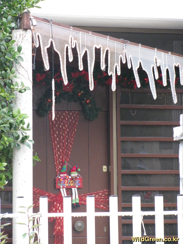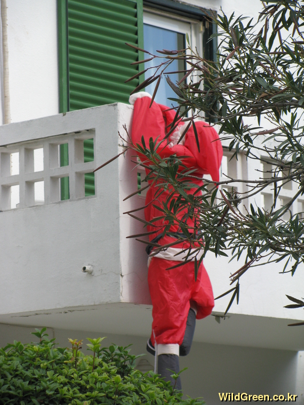 산책길에 장식이된 산탄할아버지 발코니를 넘으려.... 재미있는 표현이다. 그렇게 요란한 장식들은 별 눈에 띄지 않지만 그래도 조용히 그날을 축하 하나보다. 중심가는 어떤지 아직 가볼수가없다. 아직도 시위대들 때문에 그저 조용해 지기만을 기다릴수밖에...