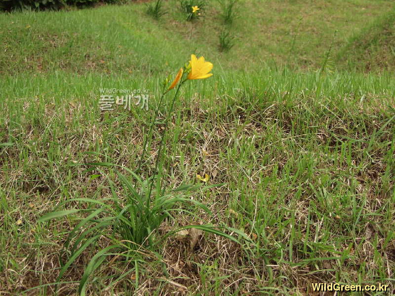 원추리............잎이 흰빛이 도는 녹색....아님........꽃줄기는 잎의 길이와 거의 같고...아님