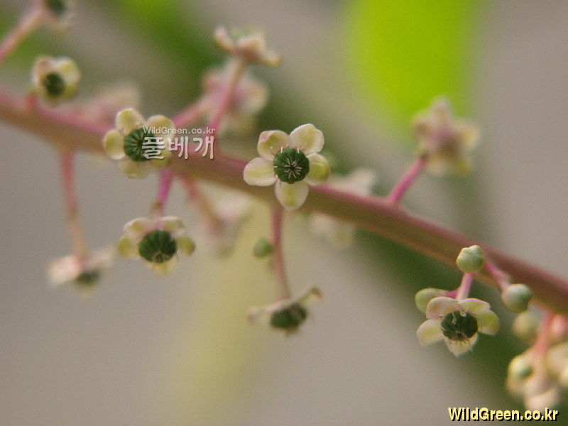 꽃은 붉은빛 도는 흰색, 개화기 6~9월.............................미국자리공